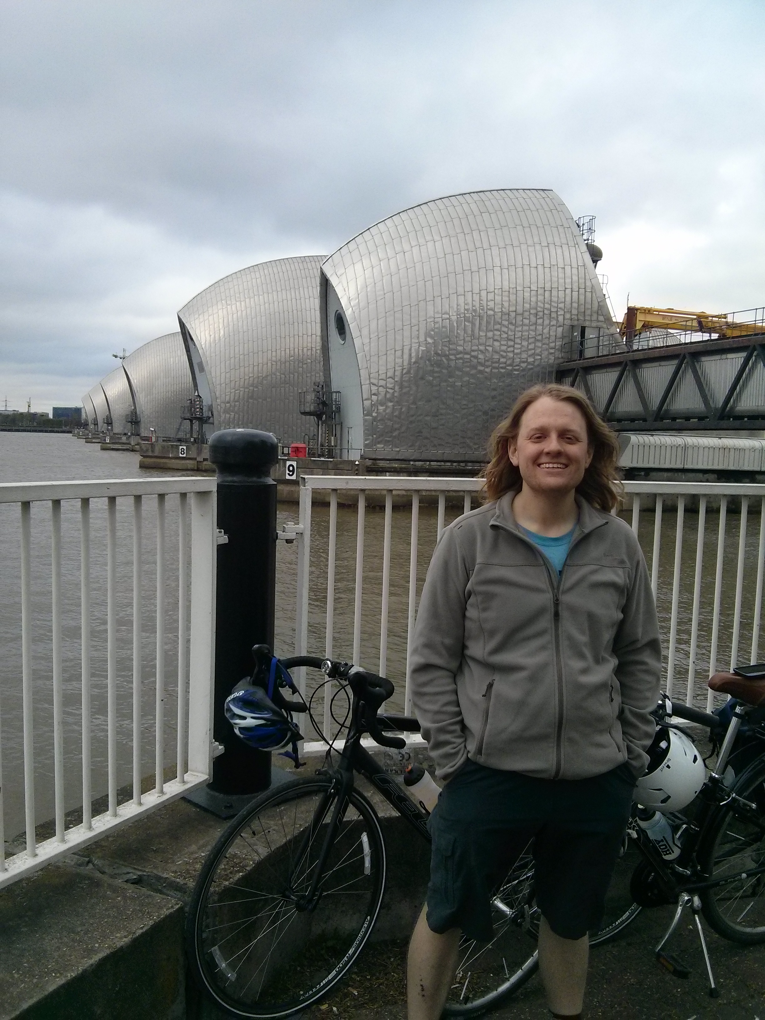 Along this stretch, we went by the Thames Barrier, which protects central London from flooding by preventing the tide flowing up the river at times of high water flow, another thing we’d been meaning to see for years. We used this opportunity to have the last of our cake and snap a few shamelessly touristy photos.